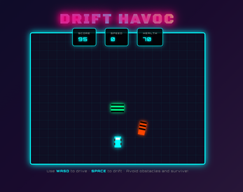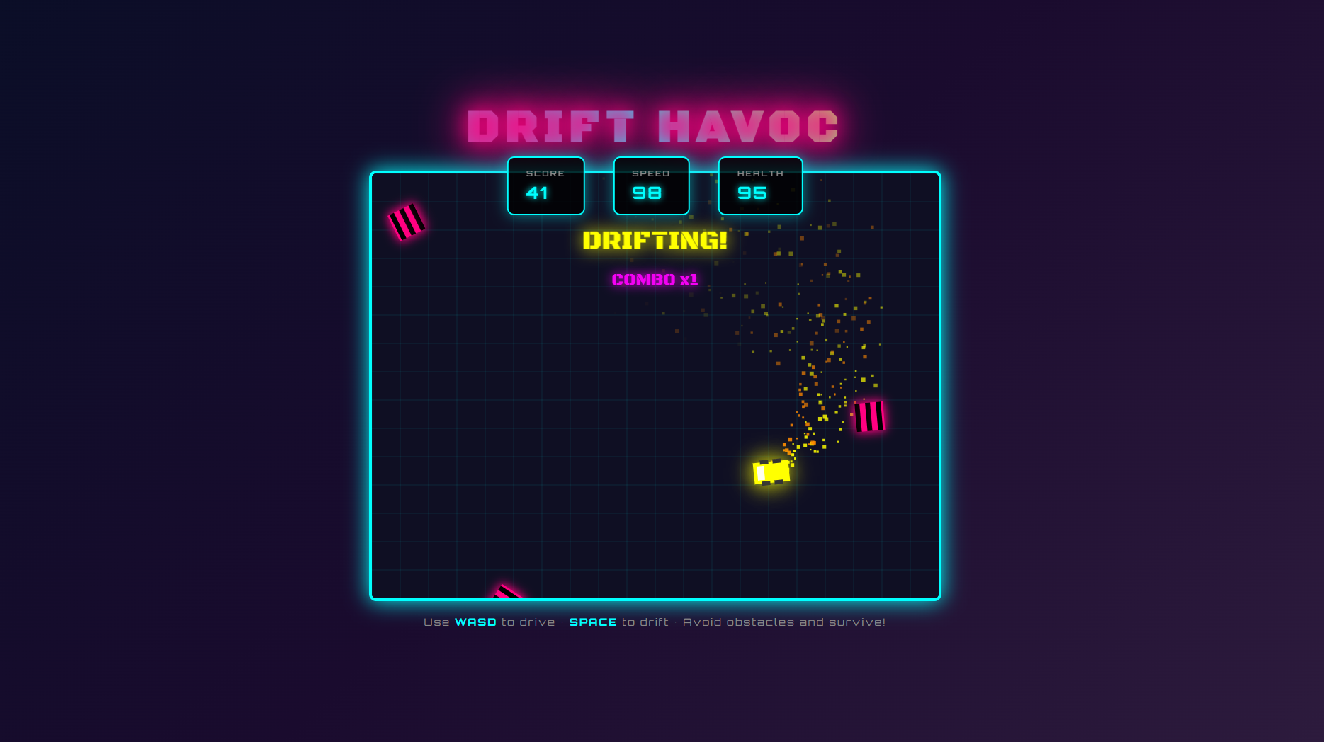 DRIFT HAVOC is an intense arcade-style driving game where you pilot a neon-powered vehicle through an endless gauntlet of deadly obstacles. Master the art of drifting to survive the chaos, rack up insane combo multipliers, and compete for the highest score. With its retro-cyberpunk aesthetic, dynamic sound effects, and physics-based drifting mechanics, Drift Havoc delivers pure adrenaline-fueled action.